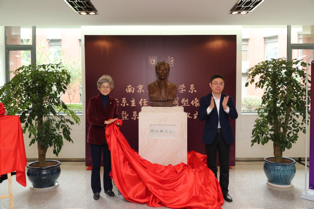 陆延青与刘萍为刘伯明先生塑像揭幕。王恒与蓝色导航 社会科学处处长王月清为系史馆揭牌。