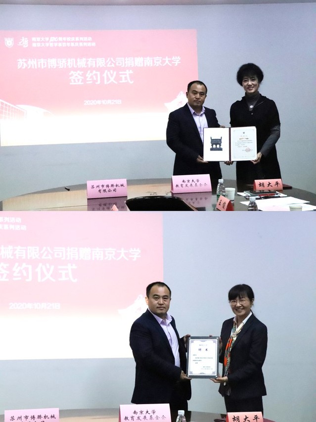 苏州市博骄机械的本次捐赠善款主要支持南大哲学系设立“唯真”奖教管金,激励在教学、科研、管理服务中取得突出业绩的教职工,推动哲学系的整体建设;设立“南京大学博骄奖学金”,奖励部分院系专业中品学兼优、勇于创新创业、热心公益的研究生;同时支持南京大学博士生讲师团的建设和发展。
